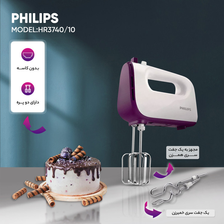 همزن «فیلیپس» (Philips) مدل «HR3740/10» دستگاهی بسیار مفید و کارآمد در آشپزخانه است. این همزن با توان 400 واتیاش میتواند در تهیه و ترکیب مواد اولیه آشپزی و شیرینیپزی کمک شایانی به مصرفکننده بکند. سَریهای مختلف همزن بهصورت جفتی کار میکنند و هر چیزی را مخلوط کرده و هم میزنند. برای همزدن مواد مختلف، میتوان دستگاه را در پنج سرعت متفاوت تنظیم کرد. درنتیجه میتوانید با توجه به مواد اولیه، سرعت را تنظیم کنید؛ همچنین با قراردادن همزن در حالت توربو، سرعت آن افزایش یافته و در زمان کم مواد را با یکدیگر مخلوط میکند. سَریهای همزن بهراحتی از دستگاه جدا و شسته میشوند. همراه آن دو عدد تیغهی خمیرزن ارائه میشود که برای درستکردن نان و خمیر بسیار کارآمد هستند. اتصال آنها به همزن بسیار ساده است. طول کابل همزن 1.2متر است. با تهیهی این همزن خوشساخت، آشپزی و شیرینیپزی با سرعت و لذت بیشتری انجام میشود. این محصول برای آشپزی روزانه و حرفهای قابل استفاده است.