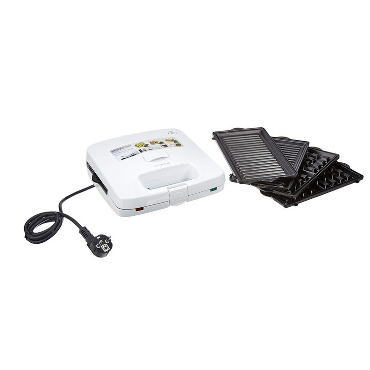 ساندویچ ساز 3 کاره کنوود (گریل، ساندویچ ساز ، وافل ساز) شامل 3 صفحه جدا شوند نچسب، 1300 وات توان مصرف ، دو چکه گیر، شستوشوی آسان - مجهز به دستگیره قفل شونده صفحه ساندویچ ساز با ظرفیت چهار خانه (8 نان سه گوش) می باشد.