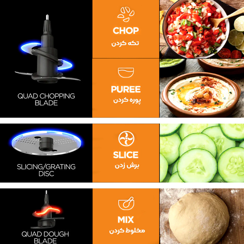 برنامه های دستی شامل سرعت کم ، سرعت زیاد و عملکرد لحظه ای یا پالس / برنامه های Auto-iQ شامل خردکن ، پوره ساز ، رنده و همزن / قابلیت شستشو لوازم در ماشین ظرفشویی / دارای تکنولوژی انحصاری Auto-iQ نینجا / دارای پایه های ضد لغزش