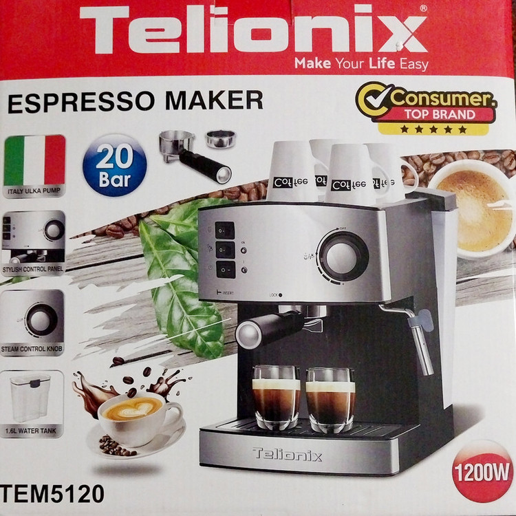 دستگاه اسپرسو ساز تلیونیکس(Telionix) مدل TEM5120 با فشار 20 بار ، عصاره گیری مطلوب انواع قهوه را دارد این دستگاه حرفه ای 1200 واتی در مقایسه با سایر نمونه ها مشابه خود بهترین و مطلوب ترین نوع عصاره گیری را انجام میدهد . xتوجه داشته باشید در هنگام استفاده برای اولین بار بعد از پر کردن مخزن اب،دستگاه را روشن نموده و بعد از سبز شدن چراغ، برای هواگیری و پمپاژ آب درجه کف شیر را یکبار کاملا باز و بسته کنید تا راحت تر هواگیری شود ، در هنگام رسیدن به نقطه جوش به علت حجیم شدن اب چندقطره در سینی چکه گیر میریزه که بخار حاصله از اب هست و این امر در تمام دستگاه های خانگی طبیعی هستx