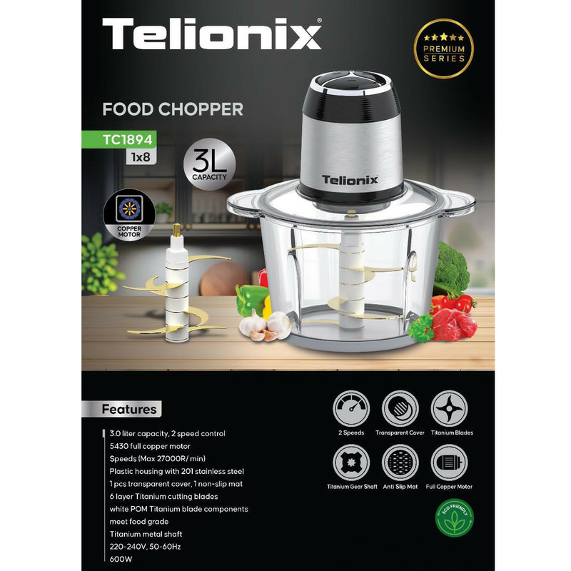 لوازم خانگی تلیونیکس یکی از با کیفیت ترین کالاهای موجود در بازار بوده و واردات و فروش این محصولات در کشورهای خلیج نشان از کیفیت این محصولات را دارد.بدون شک شرکت تلیونیکس توانسته با ارائه محصولات با کیفیت و با دوام رغیب شرکت های با برندهای معروف باشد و مشتریان زیادی را در سرتاسر جهان جذب کند. این خردکن با توان 600 وات بسیار پرقدرت بوده و با 6 تیغه استیل طلایی مواد را به خوبی و به راحتی خرد میکند .