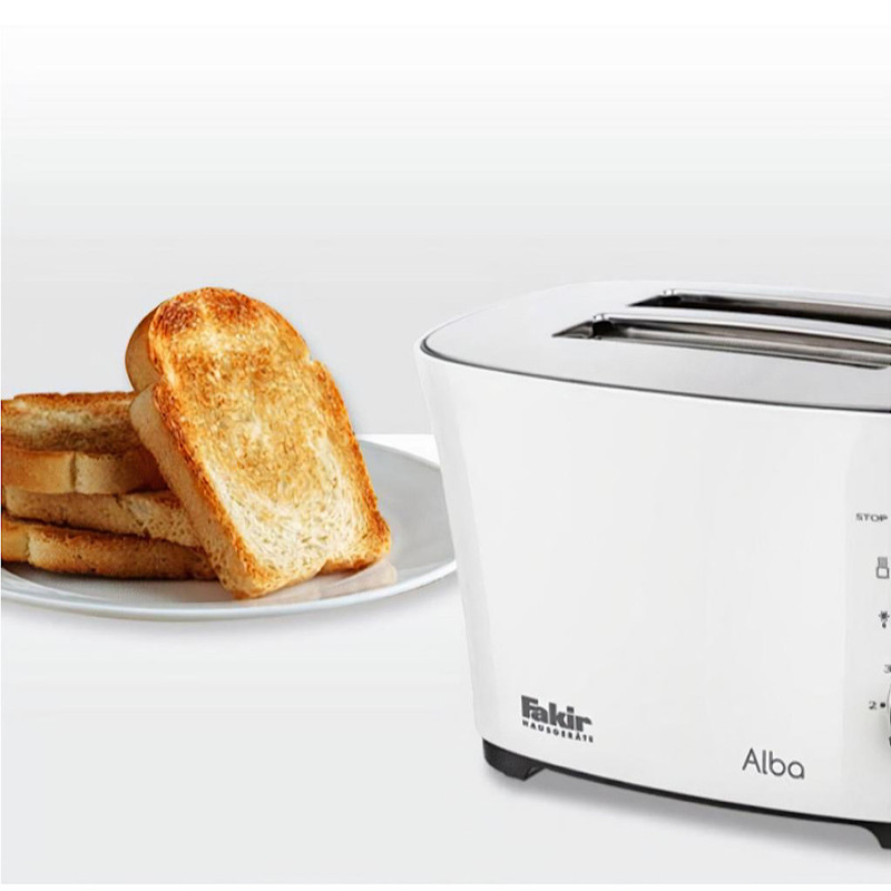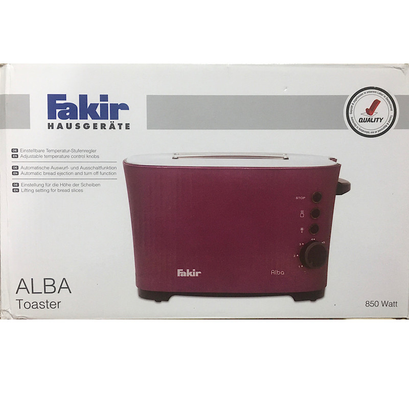 توستر «فکر» مدل «ALBA» یکی از تولیدات محبوب شرکت Fakir است. این توستر دارای دو درگاه نان بوده و برای اغلب خانوادهها با جمعیت کم یا متوسط مناسب است. قابلیت یخزدایی از مشخصات بارز و کاربردی توستر فَکِر است تا بدون نگرانی از نانی که به صورت منجمد در فریزر نگهداری میشود، یک نان تست باکیفیت و تازه بسازد. توستر ALBA دارای کشوی جمعآوری خرده نان است. در صورت تمایل با قابلیت توقف عملیات نیز میتوانید نان خود را به اندازهای کمتر از حد معمول یا تعریفشده، در دستگاه تست کنید و در هر لحظهای که خواستید پیش از توقف خودکار دستگاه، عملکرد مربوطه را متوقف کنید. دکمههای آمادهسازی دستگاه برای عملکردهای متفاوت بسیار ساده و مشخص روی دستگاه تعبیه شده است که به سادهبودن کاربری این دستگاه میافزاید. 7 مرحله تست کردن نان این امکان را برای شما فراهم می کند که نان تست خود را از نرم ترین تا برشته ترین حالت تهیه کنید. توستر دارای یک کلید آسانسوری میباشد که میتوانید به راحتی نان را پس از برشته شدن به بالا بیاورید. به وسیله ولوم چرخشی روی بدنه می توانید میزان برشته شدن نان را تنظیم کنید. فکر محصولات خود را به 106 کشور جهان از جمله ایران و ترکیه صادر میکند. این کارخانه جزو اولین برندهای لوازم خانگی در دنیاست که توانسته هرساله با نوآوری، تولید و حفظ کیفیت در بازار لوازم خانگی برقی پیشرفت چشمگیر داشته باشد.