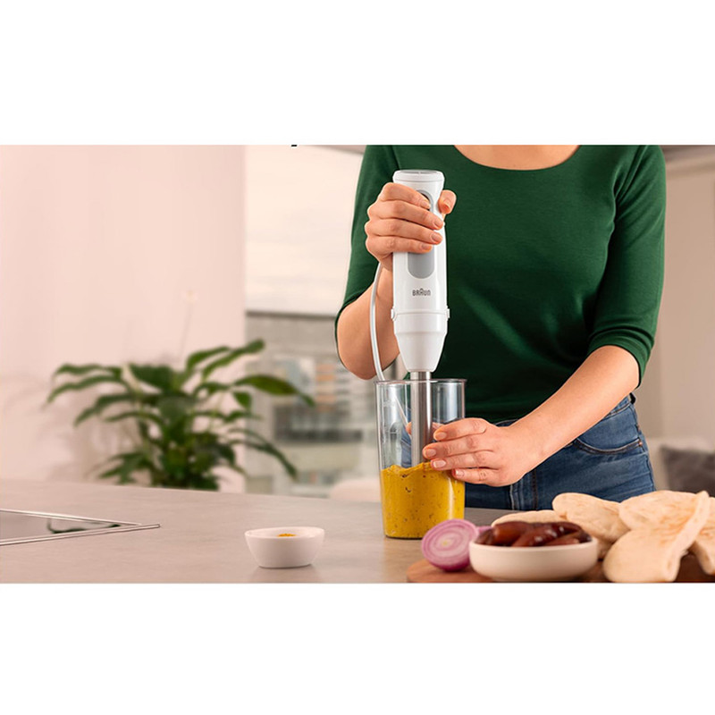 گوشت کوب برقی براون مدل MQ 50001 یکی از کارآمدترین و خوشساختترین لوازم آشپزخانه برند براون است. این محصول برای افرادی طراحی شده که به دنبال ترکیب قدرت، دوام و طراحی ارگونومیک هستند. با استفاده از این دستگاه میتوان انواع مواد غذایی را در کمترین زمان خرد، له و میکس کرد. طراحی این گوشت کوب برقی بسیار دقیق و هوشمندانه انجام شده است. بدنه با ترکیبی از پلاستیک فشرده مقاوم و استیل ضد زنگ ساخته شده و دوام بالایی دارد. دسته ارگونومیک دستگاه باعث میشود کنترل کامل در زمان استفاده حفظ شود و دست در استفاده طولانی خسته نشود. طراحی پایه ضد پاشش، از پخش شدن مواد جلوگیری میکند و محیط آشپزخانه را تمیز نگه میدارد. موتور قدرتمند 1000 واتی این مدل عملکرد فوقالعادهای ارائه میدهد. تنظیمات 21 سرعته در این دستگاه، کنترل دقیقتری بر میزان له شدن یا مخلوط شدن مواد غذایی ایجاد میکند. کاربر میتواند بسته به نوع ماده غذایی، سرعت مناسب را انتخاب کند تا بهترین نتیجه به دست آید. این ویژگی باعث افزایش کیفیت پخت و کاهش زمان آمادهسازی غذا میشود. گوشت کوب برقی براون مدل MQ 50001 تنها یک وسیله ساده برای خرد کردن نیست. این دستگاه برای تهیه سوپ، پوره، سس، نوشیدنی و اسموتی نیز کاربرد دارد. تیغههای تیز استیل ضد زنگ مواد را بهصورت یکنواخت خرد میکنند. با این عملکرد، بافت مواد کاملاً نرم و یکدست میشود و طعم غذا طبیعیتر باقی میماند.