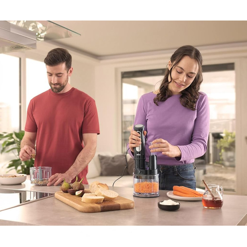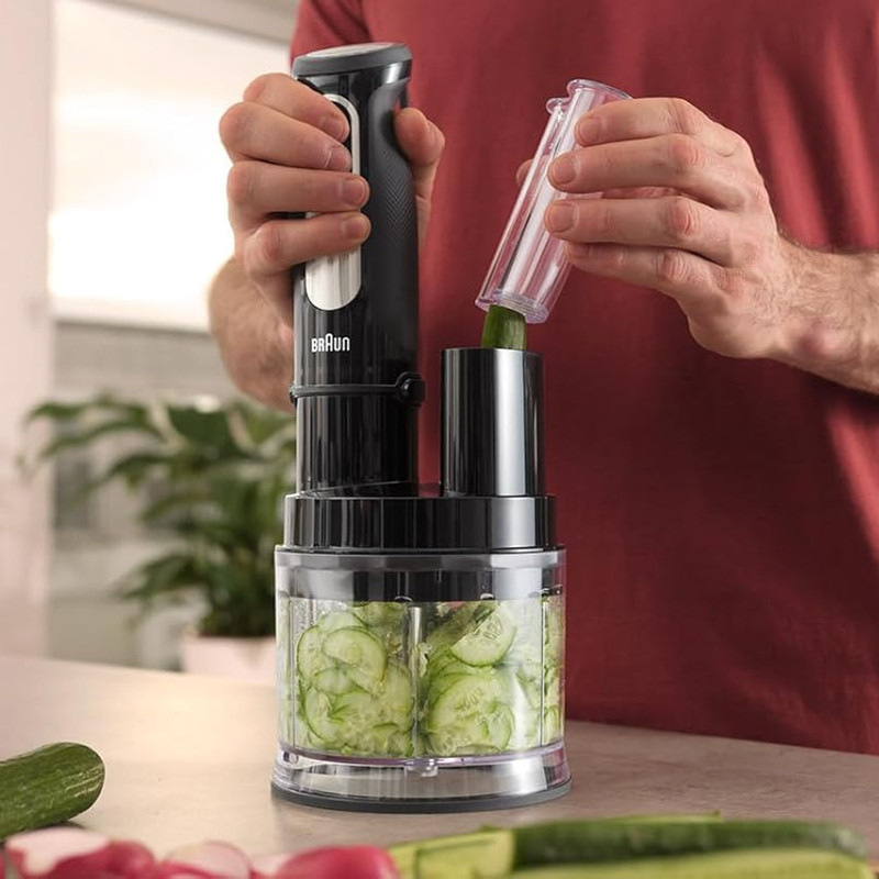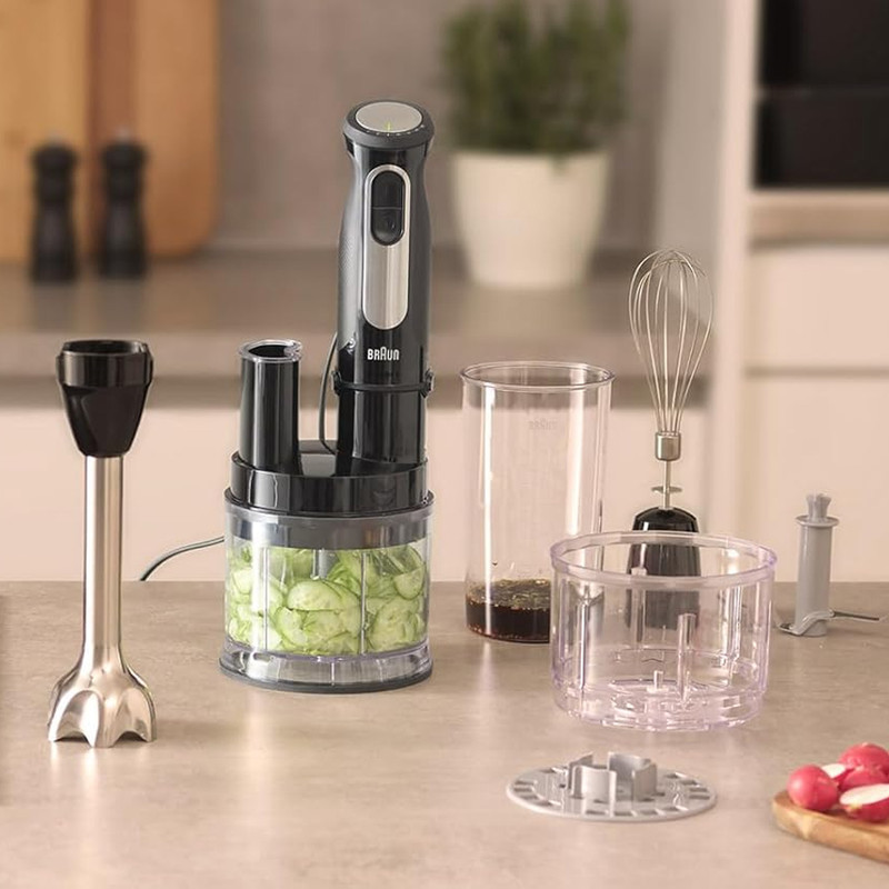 گوشتکوب برقی براون مدل MQ 55755 یکی از حرفهایترین و کاملترین محصولات خانگی برند معتبر Braun است که با طراحی ارگونومیک، قدرت بالا و مجموعهای از لوازم جانبی متنوع، به انتخابی ایدهآل برای هر آشپزخانه تبدیل شده است. این دستگاه با موتور قدرتمند ۱۰۰۰ وات خود، ترکیبی از سرعت، کارایی و دقت را در اختیار شما قرار میدهد تا بهراحتی انواع مواد غذایی را خرد، مخلوط و پوره کنید. براون در این مدل از فناوری اختصاصی PowerBell VPlus بهره برده است که با طراحی خاص تیغهها و وجود پرههای داخلی، مواد غذایی را سریعتر و یکنواختتر خرد میکند. همچنین وجود سیستم ضدپاشش (SplashControl) باعث میشود هنگام کار، آشپزخانه تمیز بماند و هیچگونه ریختوپاشی اتفاق نیفتد. یکی از ویژگیهای متمایز این محصول، ۲۵ سطح سرعت متغیر به همراه دکمه توربو است که امکان کنترل کامل روی بافت و کیفیت نهایی مواد غذایی را فراهم میکند. چه بخواهید یک سوپ نرم و لطیف تهیه کنید یا قطعاتی ریز و درشت برای سالاد، این دستگاه پاسخگوی نیازهای شما خواهد بود. طراحی EasyClick Plus در گوشتکوب برقی براون MQ 55755 باعث میشود تعویض لوازم جانبی بسیار آسان و سریع انجام گیرد. در بستهبندی این محصول، مجموعهای کامل از اقلام همراه وجود دارد؛ از جمله لیوان مدرج ۶۰۰ میلیلیتری، خردکن ۵۰۰ میلیلیتری، کاسه چندکاره با قابلیت خردکردن یخ، تیغه مخصوص یخخردکن، دیسک رنده و برش، و همچنین همزن استیل برای تهیه خامه یا تخممرغ همزده. این تنوع در لوازم جانبی باعث میشود دستگاه به یک همراه همهکاره در آشپزخانه تبدیل شود. تمام قطعاتی که با مواد غذایی در تماس هستند، از جنس BPA Free ساخته شدهاند و کاملاً ایمن و بهداشتیاند. همچنین بیشتر بخشهای قابل جداسازی دستگاه قابل شستوشو در ماشین ظرفشویی هستند که تمیزکاری آن را بسیار ساده میکند. کابل برق ۱.۲ متری دستگاه نیز آزادی عمل مناسبی هنگام کار فراهم میآورد. در مجموع، گوشتکوب برقی براون مدل 55755 نه تنها یک وسیله کاربردی، بلکه ابزاری حرفهای برای کسانی است که به کیفیت، سرعت و دقت در آشپزی اهمیت میدهند. طراحی زیبا و مدرن، قدرت بالا و لوازم جانبی کامل این محصول، آن را به انتخابی ممتاز برای هر خانه تبدیل کرده است.
